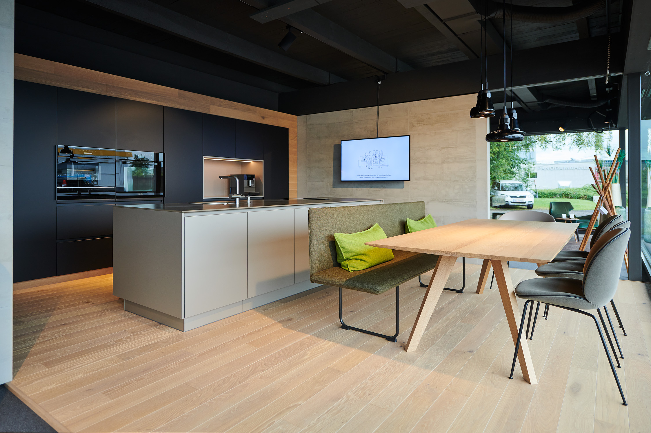 Die Küchenausstellung bei Hutle umfasst 3 Musterküchen. Der gesamte Schauraum ist ca. 350 m² groß.